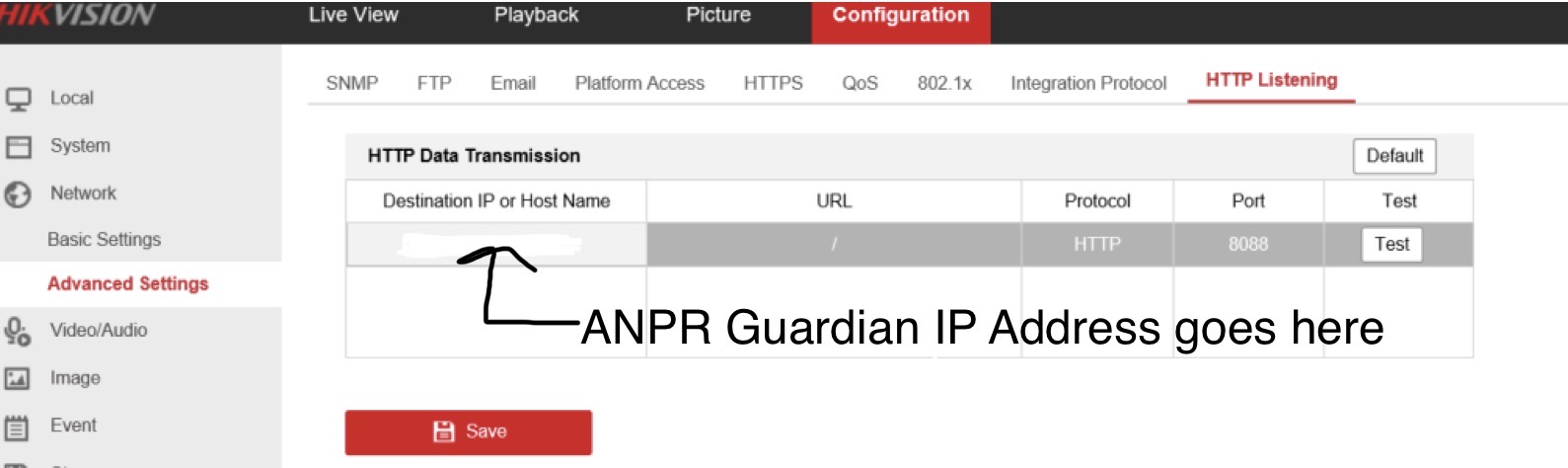 Destination IP or Host Name - This is the IP address you set for the ANPR Guardian in step 1