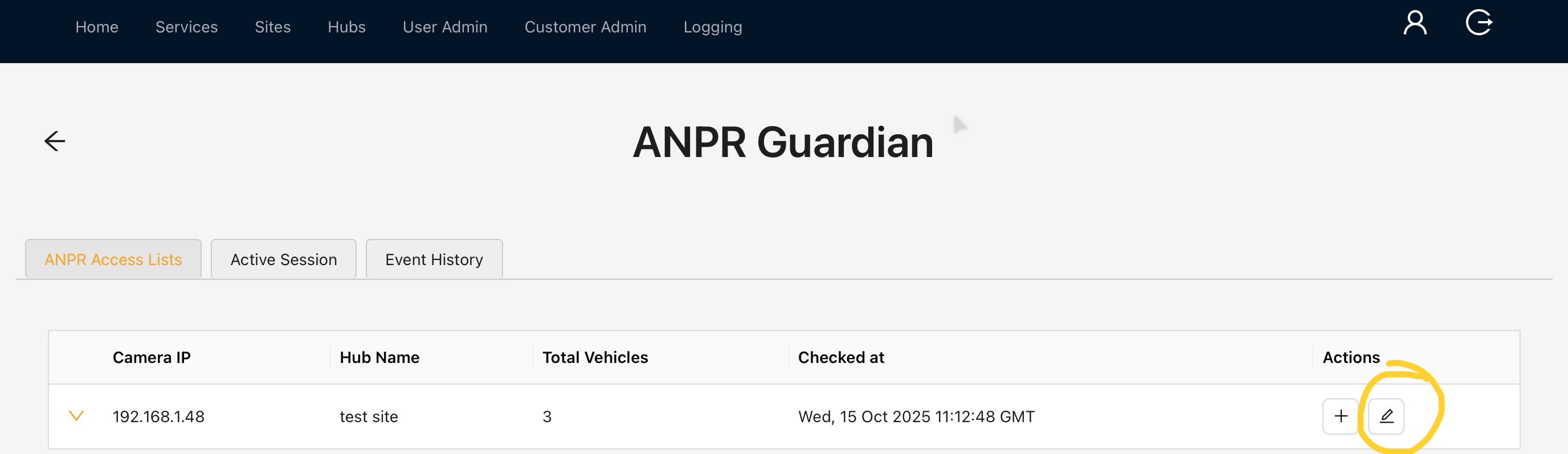 Step 3: Click Services > ANPR Guardian > Select the site name you would like to setup > Then click the pencil icon on the right hand side.