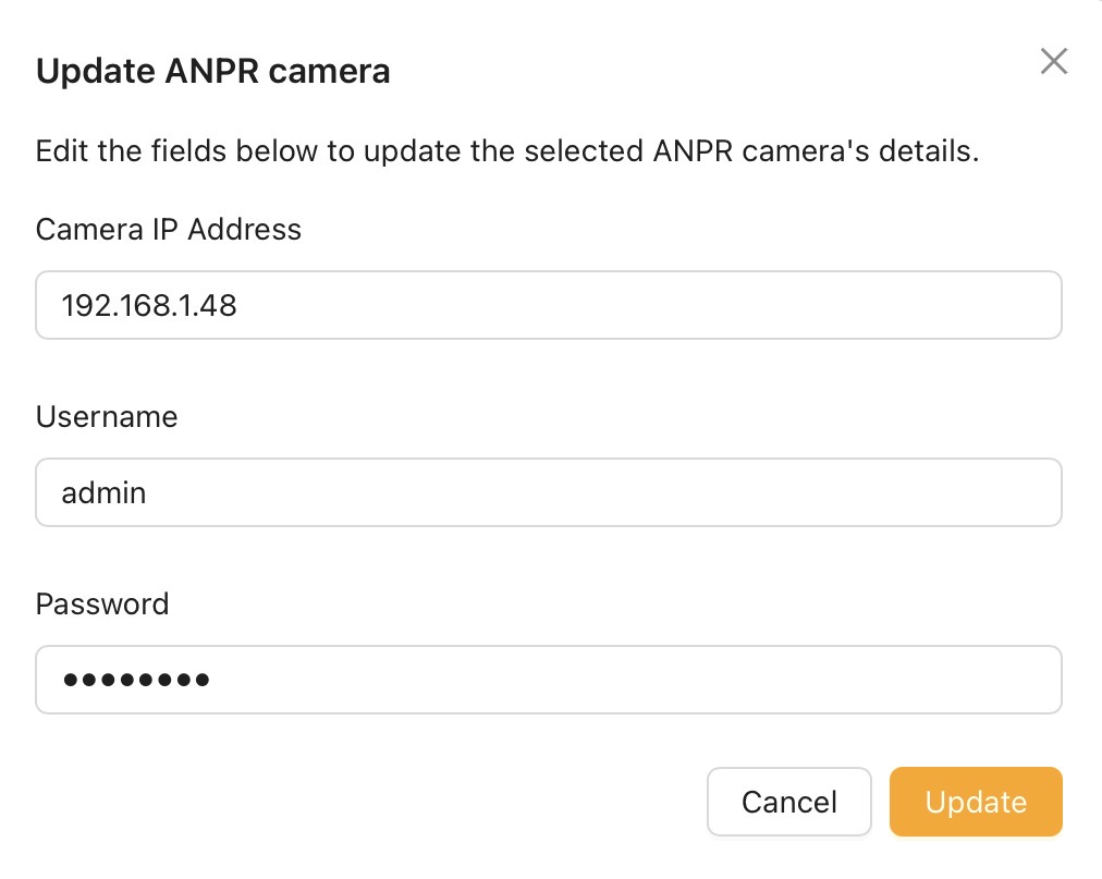 Step 4: Enter the ANPR Cameras details - IP Address, user name and password > Then click update.